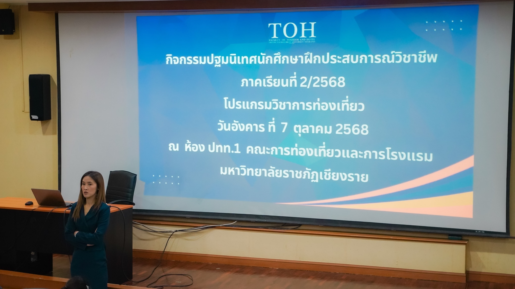 เมื่อวันที่ 7 ตุลาคม 2568 โปรแกรมวิชาการท่องเที่ยว คณะการท่องเที่ยวและการโรงแรม มหาวิทยาลัยราชภัฏเชียงราย ได้จัดกิจกรรม"ปฐมนิเทศก่อนออกฝึกประสบการณ์วิชาชีพด้านการท่องเที่ยว" สำหรับนักศึกษา ชั้นปีที่ 4 เพื่อมอบแนวทางเตรียมความพร้อมและชี้แจงระเบียบการปฏิบัติงานในสถานประกอบการจริง ก่อนการเดินทางออกไปฝึกประสบการณ์ทั่วประเทศ กิจกรรมนี้ได้รับเกียรติจาก อาจารย์ ดร.อุทุมพร การเก็บ ประธานโปรแกรมวิชาการท่องเที่ยว พร้อมด้วยคณาจารย์ประจำโปรแกรมวิชา ร่วมให้ข้อเสนอแนะเชิงลึกและแนวทางปฏิบัติที่สำคัญแก่นักศึกษา จำนวนทั้งสิ้น 23 คน การปฐมนิเทศมุ่งเน้นการสร้างความเข้าใจในการบูรณาการความรู้ทางทฤษฎีเข้ากับการปฏิบัติงานจริงในอุตสาหกรรมการท่องเที่ยวและบริการโดยนักศึกษาจะออกฝึกประสบการณ์ในสถานประกอบการด้านการท่องเที่ยวชั้นนำในพื้นที่หลากหลายภูมิภาคทั้งภาคเหนือ ภาคกลาง และภาคใต้ ทั้งนี้ เพื่อให้มั่นใจว่านักศึกษาทุกคนมีความพร้อมสูงสุดในการก้าวสู่การเป็นบุคลากรที่มีคุณภาพและเป็นมืออาชีพ โดยสามารถนำทักษะความรู้ไปใช้ในการปฏิบัติงานได้อย่างแท้จริงตลอดระยะเวลาการฝึกประสบการณ์วิชาชีพ ณ ห้อง ปทท.1 คณะการท่องเที่ยวและการโรงแรม มรภ.เชียงราย
