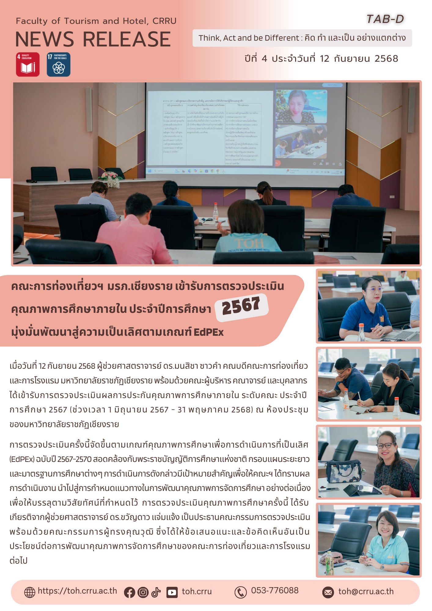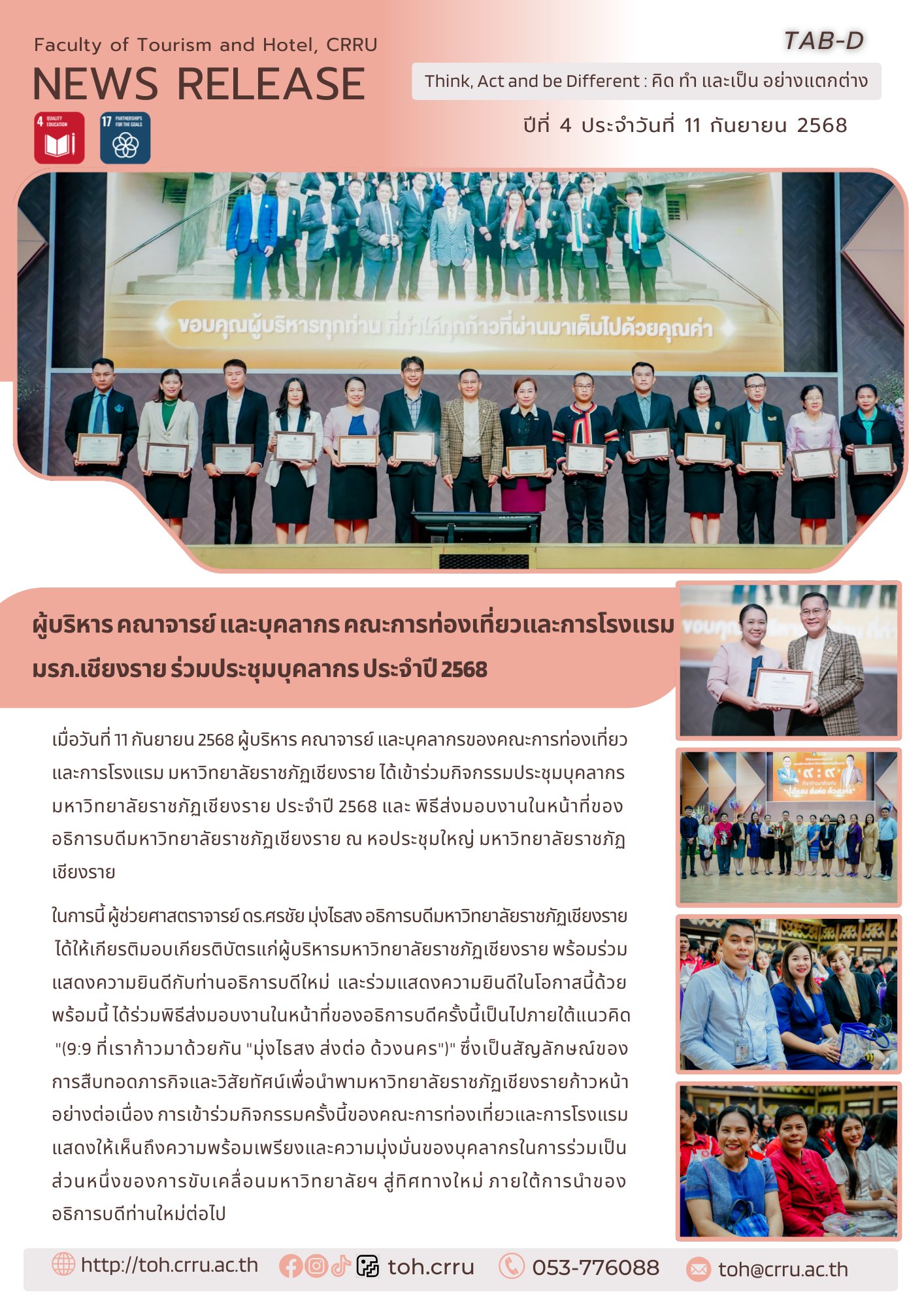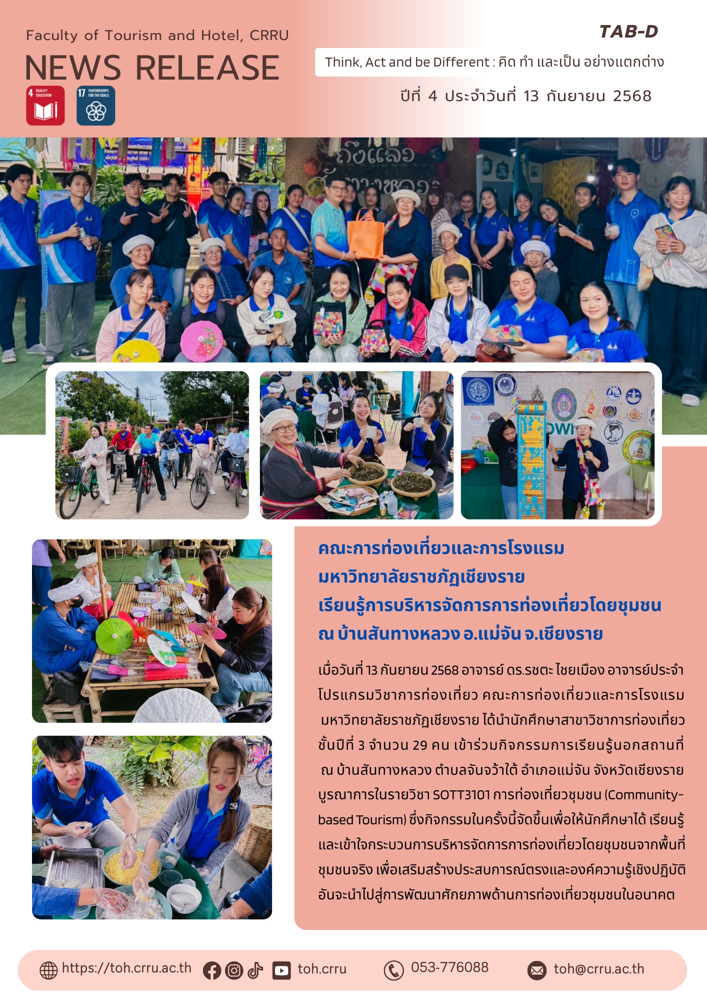 คณะการท่องเที่ยวและการโรงแรม มหาวิทยาลัยราชภัฏเชียงราย (หมายเลขอาคาร 111) เลขที่ 80 หมู่ 9 ตำบลบ้านดู่ อำเภอเมือง จังหวัดเชียงราย 57100